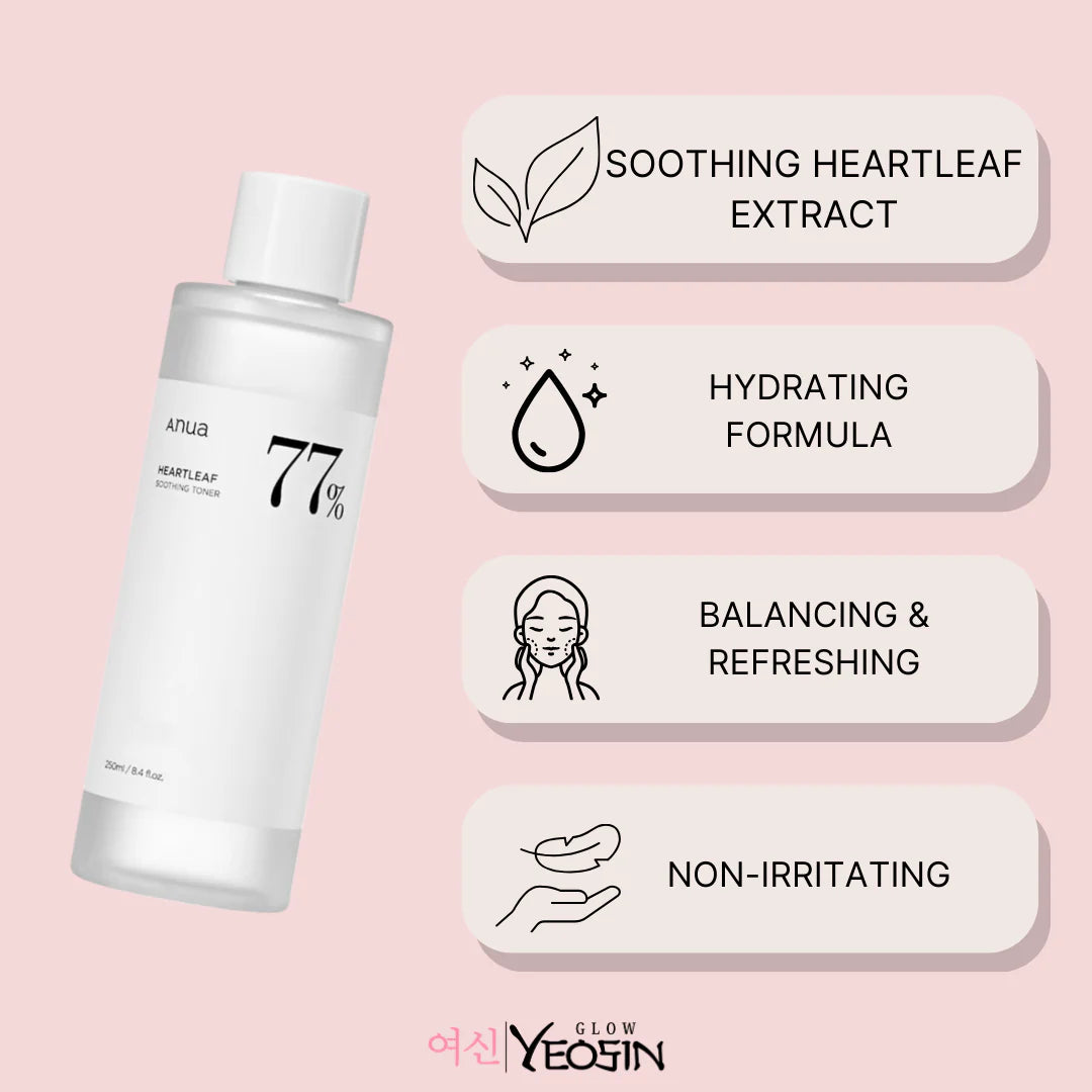 Anua Heartleaf 77% Soothing Toner is a gentle toner with 77% heartleaf extract to calm inflammation, reduce redness, and balance pH. Its hydrating formula restores moisture, leaving skin soft and refreshed. Free from harsh chemicals and artificial fragrances, this cruelty-free toner is suitable for all skin types, including sensitive skin, promoting a clear and healthy complexion.