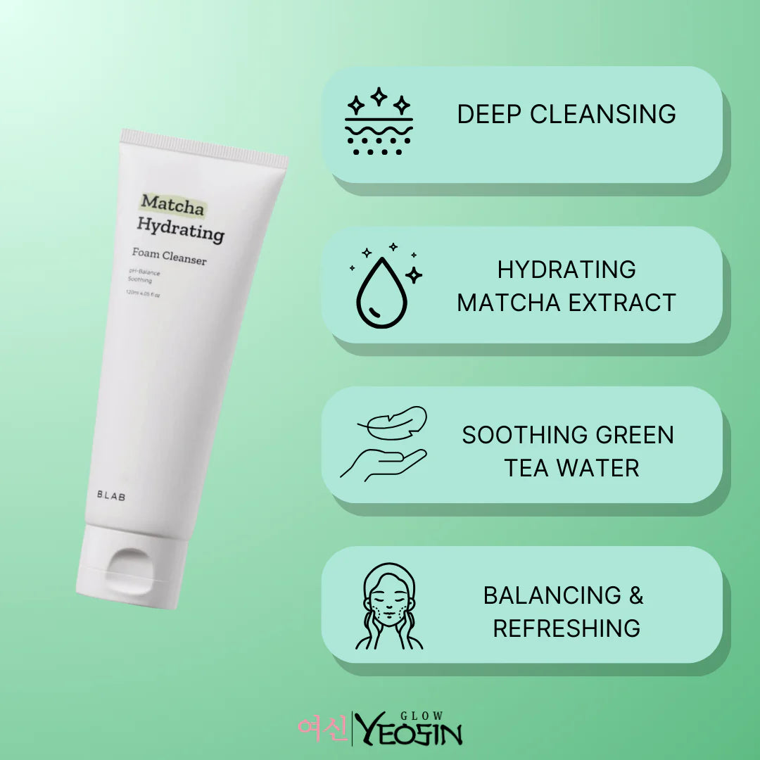 B Lab Matcha Hydrating Foam Cleanser gently cleanses while hydrating and refreshing the skin. Enriched with antioxidant-rich matcha extract and soothing green tea water, it removes impurities without stripping moisture. Dermatologist-tested and suitable for all skin types, it leaves the complexion clean, balanced, and revitalized.