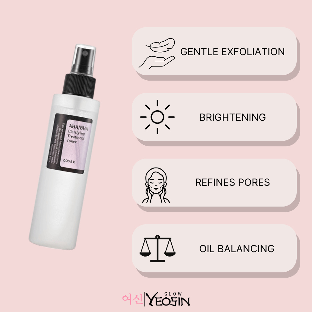 The COSRX AHA/BHA Clarifying Treatment Toner is a gentle, exfoliating toner designed to improve skin texture, brighten the complexion, and refine pores. Infused with natural AHA (glycolic acid) and BHA (salicylic acid), it effectively removes dead skin cells and impurities while balancing oil production. Suitable for all skin types, especially dull or congested skin, this toner promotes a smoother, more radiant complexion and keeps the skin hydrated and soothed.