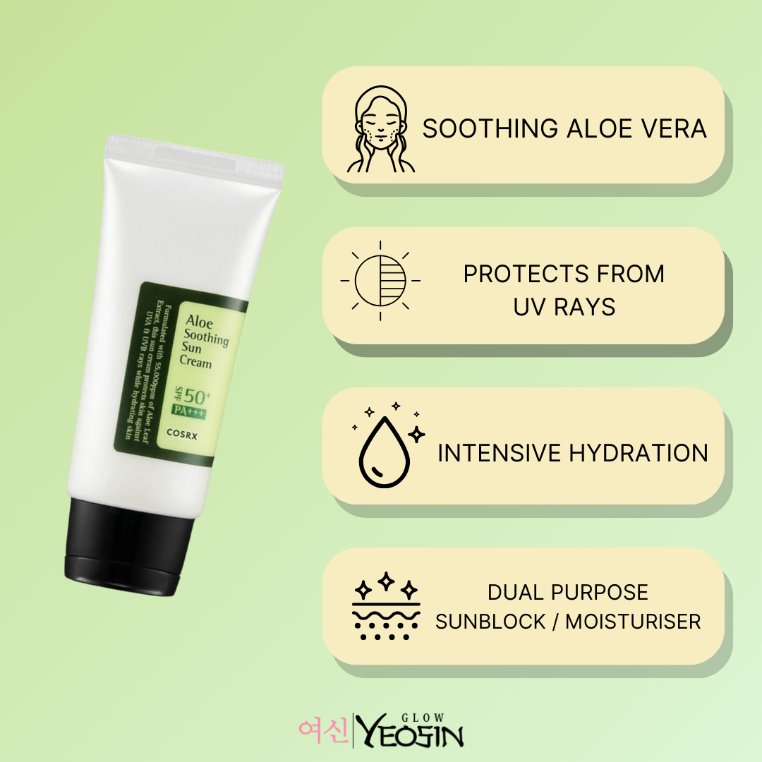 COSRX Aloe Soothing Sun Cream offers lightweight, broad-spectrum SPF protection combined with the calming, hydrating benefits of aloe vera. Ideal for sensitive skin, it soothes and moisturizes without leaving a greasy finish. This dual-purpose sunscreen and moisturizer is rich in antioxidants, defending against environmental stressors while maintaining a smooth, youthful look, making it perfect for daily use.