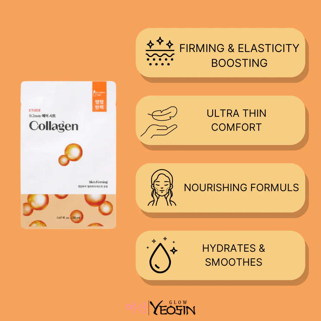 Revitalize your skin with the ETUDE HOUSE 0.2 Therapy Air Mask Collagen. This ultra-thin, collagen-infused mask boosts elasticity, reduces aging signs, and hydrates for a firm, radiant look. Suitable for all skin types, it adheres comfortably to deliver gentle, nourishing care. Perfect for an at-home pamper or pre-event glow.