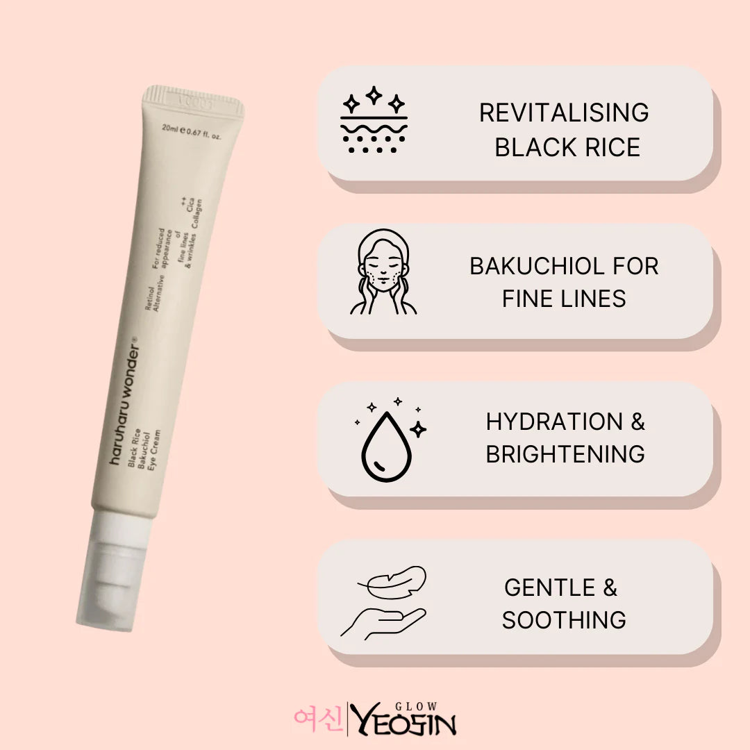 Haruharu WONDER Black Rice Bakuchiol Eye Cream rejuvenates the delicate eye area with antioxidant-rich black rice and bakuchiol, a gentle retinol alternative. It targets fine lines, puffiness, and dark circles, deeply hydrating and brightening to reveal refreshed, youthful eyes. Fast-absorbing and suitable for all skin types, this nourishing eye cream leaves the under-eyes smooth, firm, and radiant.