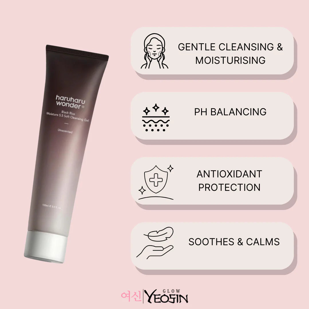The Haruharu WONDER - Black Rice Moisture 5.5 Soft Cleansing Gel is formulated to gently cleanse the skin while maintaining its moisture balance. Infused with black rice extract, this cleansing gel provides antioxidant benefits to protect the skin from environmental stressors. Suitable for all skin types, it effectively removes impurities and makeup residues without stripping the skin of its natural oils. After use, your skin feels refreshed, hydrated, and balanced, promoting a clear and healthy complexion.