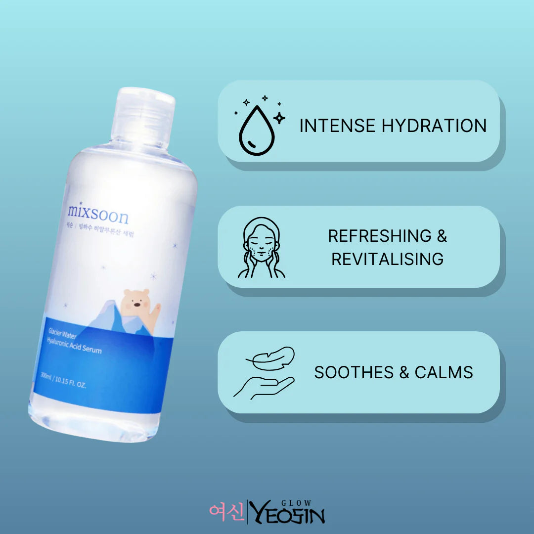 Mixsoon Glacier Water Hyaluronic Acid Serum combines glacier water and hyaluronic acid to deeply hydrate and refresh the skin, leaving it smooth, plump, and radiant. Infused with Centella Asiatica and Niacinamide, it soothes irritation and improves skin texture. Suitable for all skin types, this dermatologist-tested serum provides long-lasting hydration for a healthy, glowing complexion.