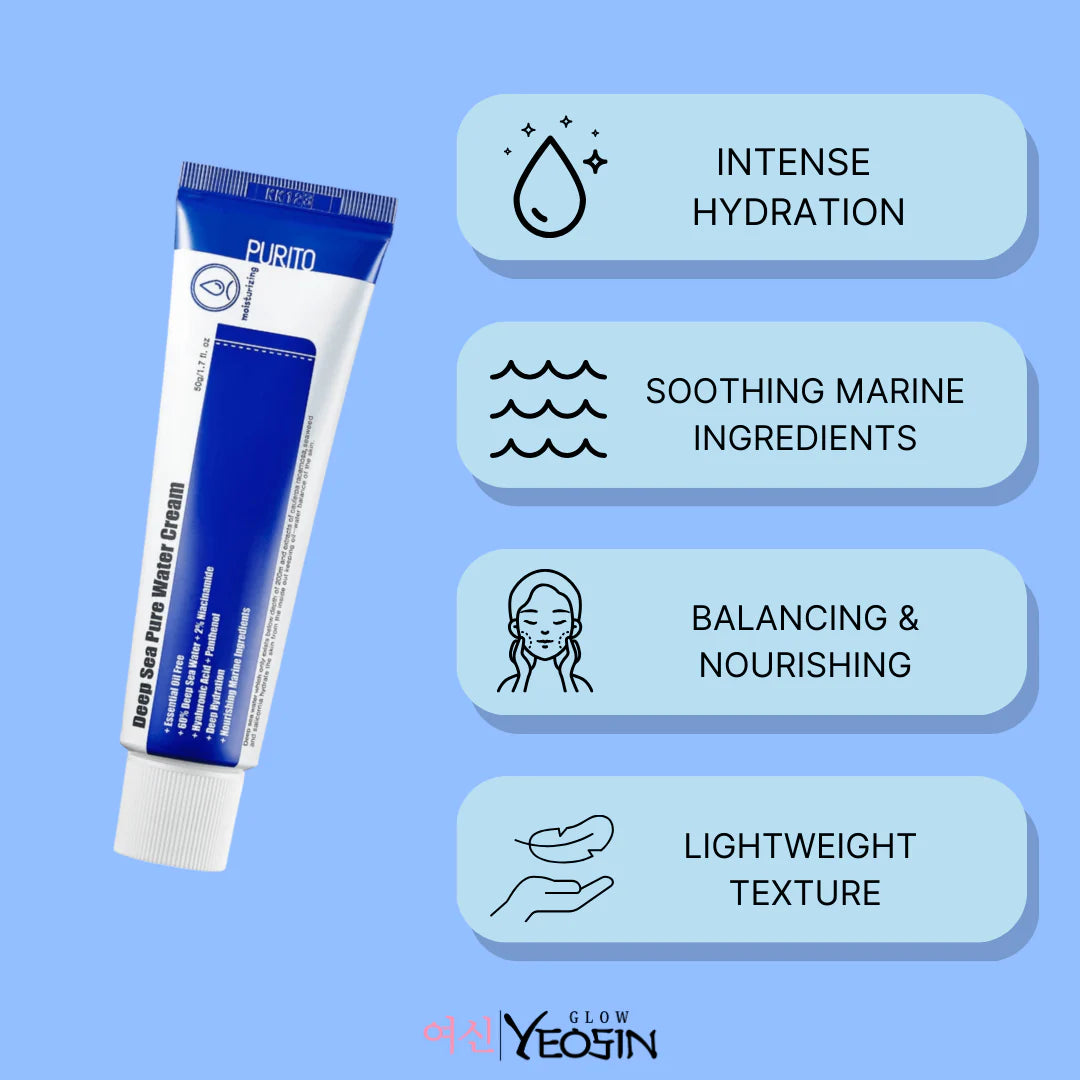 The Purito Deep Sea Water Cream, a highly effective Purito Moisturiser, provides intense hydration powered by deep sea water to revitalize and plump the skin. Infused with marine extracts like seaweed and algae, it soothes redness and promotes a calm, balanced complexion. This lightweight, fast-absorbing formula is non-greasy and residue-free, making it ideal for daily use. Dermatologist-tested and suitable for all skin types, the Purito Deep Sea Water Cream deeply nourishes for a radiant, healthy glow.