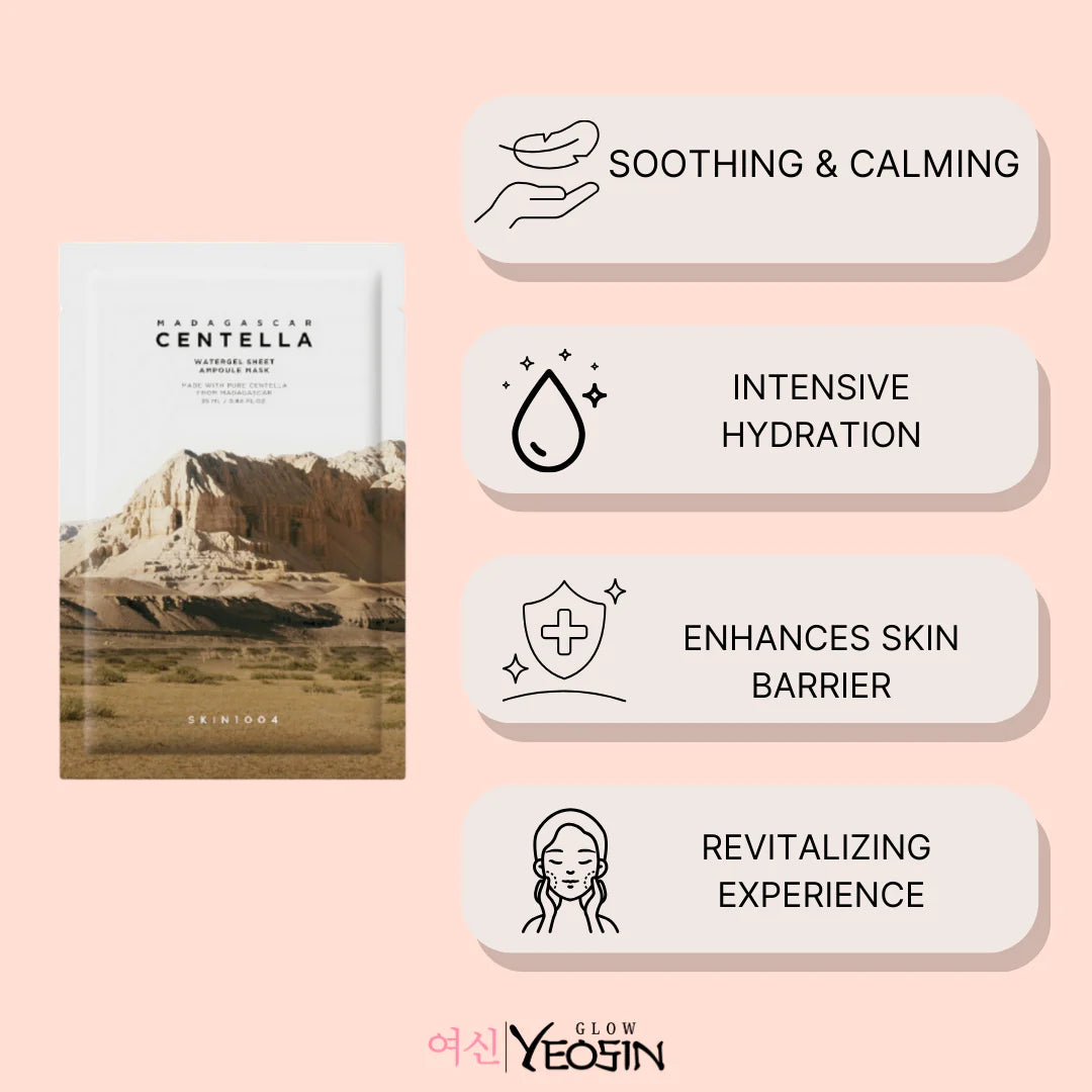 The SKIN1004 Madagascar Centella Watergel Sheet Ampoule Mask delivers deep hydration and soothing relief with pure Centella Asiatica extract from Madagascar. This cooling hydrogel mask calms irritation, replenishes moisture, and strengthens the skin barrier in one use, leaving skin smooth, revitalized, and refreshed. Gentle and safe, it suits all skin types, including sensitive skin.