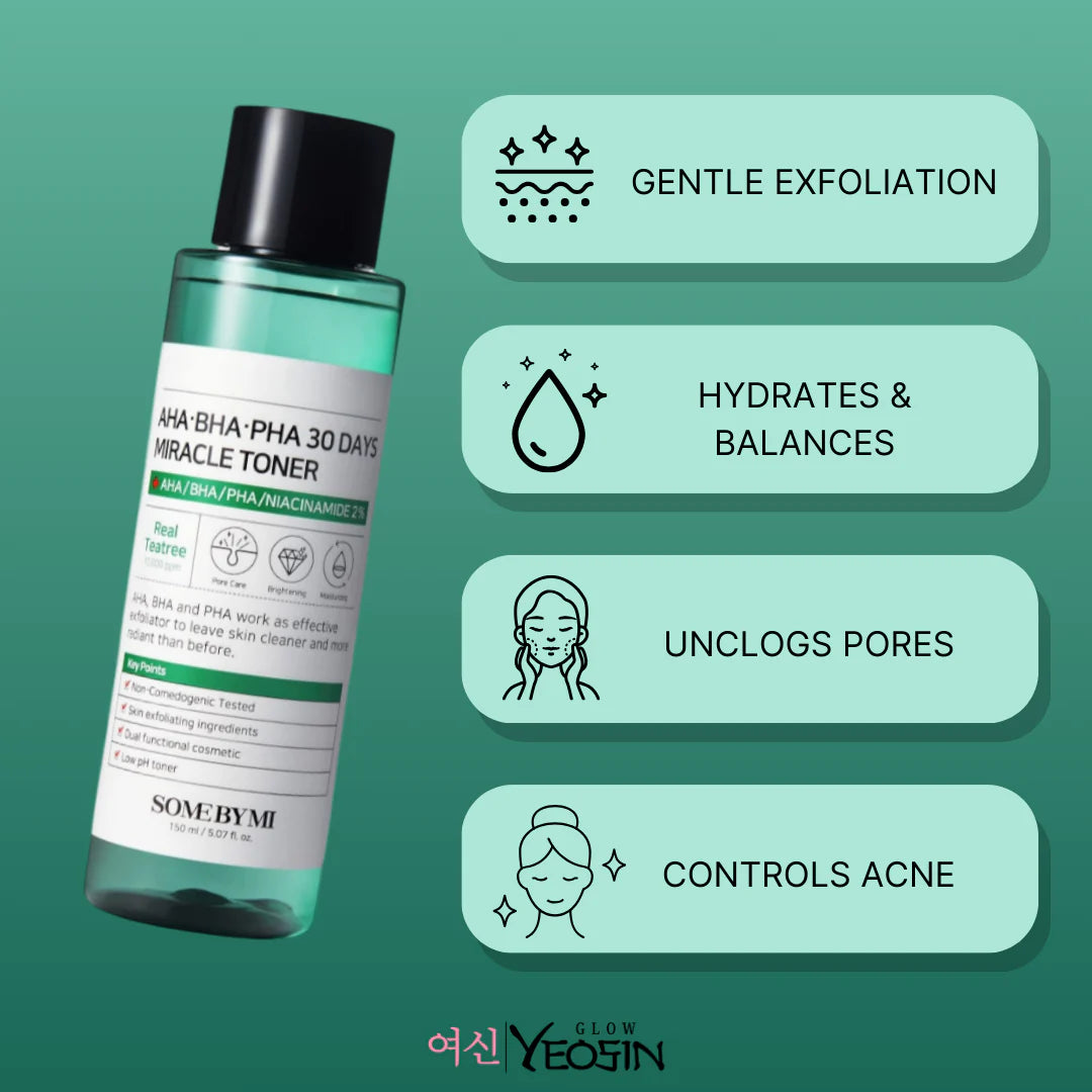 SOME BY MI AHA, BHA, PHA 30 Days Miracle Toner gently exfoliates, unclogs pores, and reduces acne, leaving skin clearer and smoother. With tea tree, niacinamide, and hyaluronic acid, it hydrates, balances, and soothes for a refreshed complexion. Safe for all skin types, it's a daily essential for healthier skin.