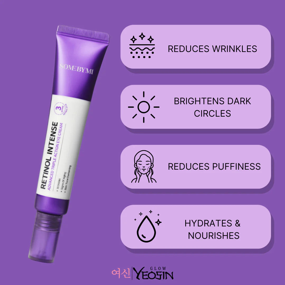 The SOME BY MI Retinol Intense Advanced Triple Action Eye Cream targets fine lines, wrinkles, dark circles, and puffiness for a rejuvenated under-eye area. Infused with retinol, adenosine, caffeine, hyaluronic acid, and shea butter, it firms, brightens, hydrates, and reduces swelling, leaving the skin around your eyes youthful and radiant. Suitable for all skin types, including sensitive skin, this eye cream helps combat signs of aging for a smoother, more refreshed appearance.