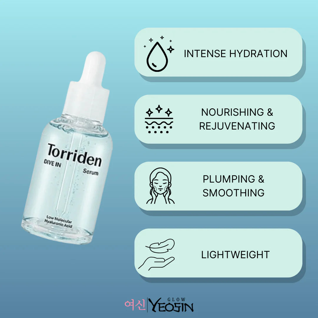 Torriden DIVE-IN Low Molecule Hyaluronic Acid Serum deeply hydrates with low-weight hyaluronic acid, plumping and smoothing skin. Enriched with green tea and centella asiatica, it nourishes and revitalizes, leaving a refreshed, radiant complexion. Lightweight, non-sticky, and safe for all skin types.